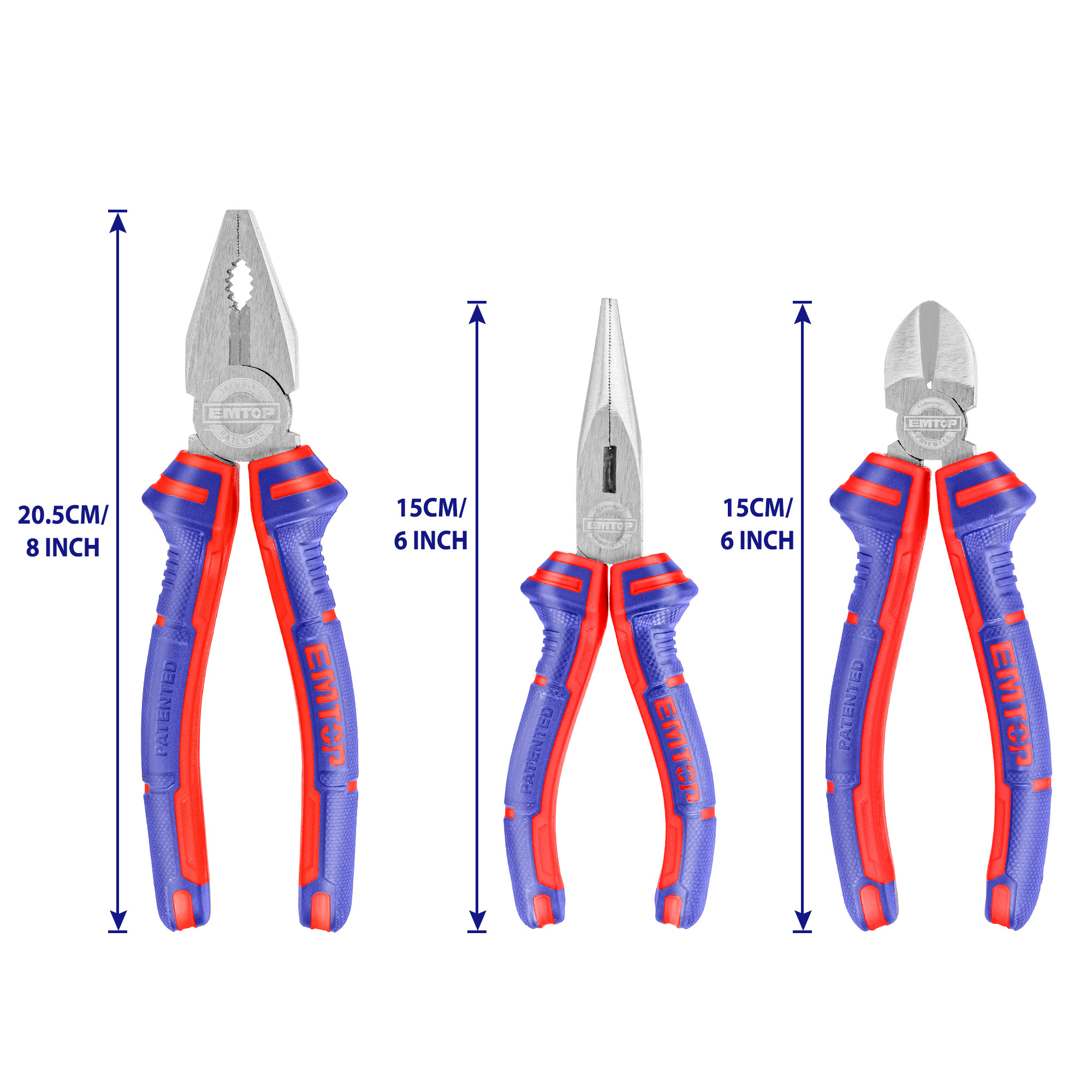EMTOP 3PCS Pliers Set, 8 Inch Combination Pliers,6 Inch Long Nose Pliers,6 Inch Diagonal Cutting pliers Multifunctional Wire Cutters Plier EPLS0311