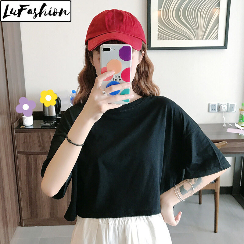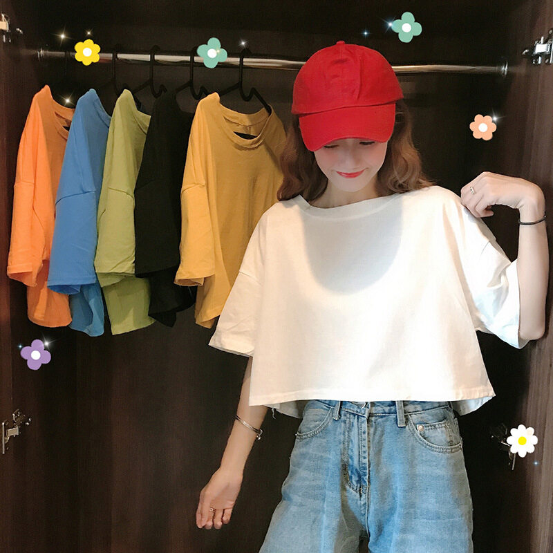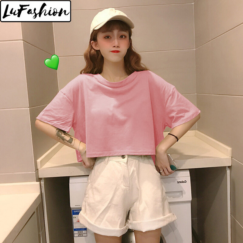 LuFashion Crop Tops for Women Summer Candy Colors Short Sleeve Plain Casual T-Shirts