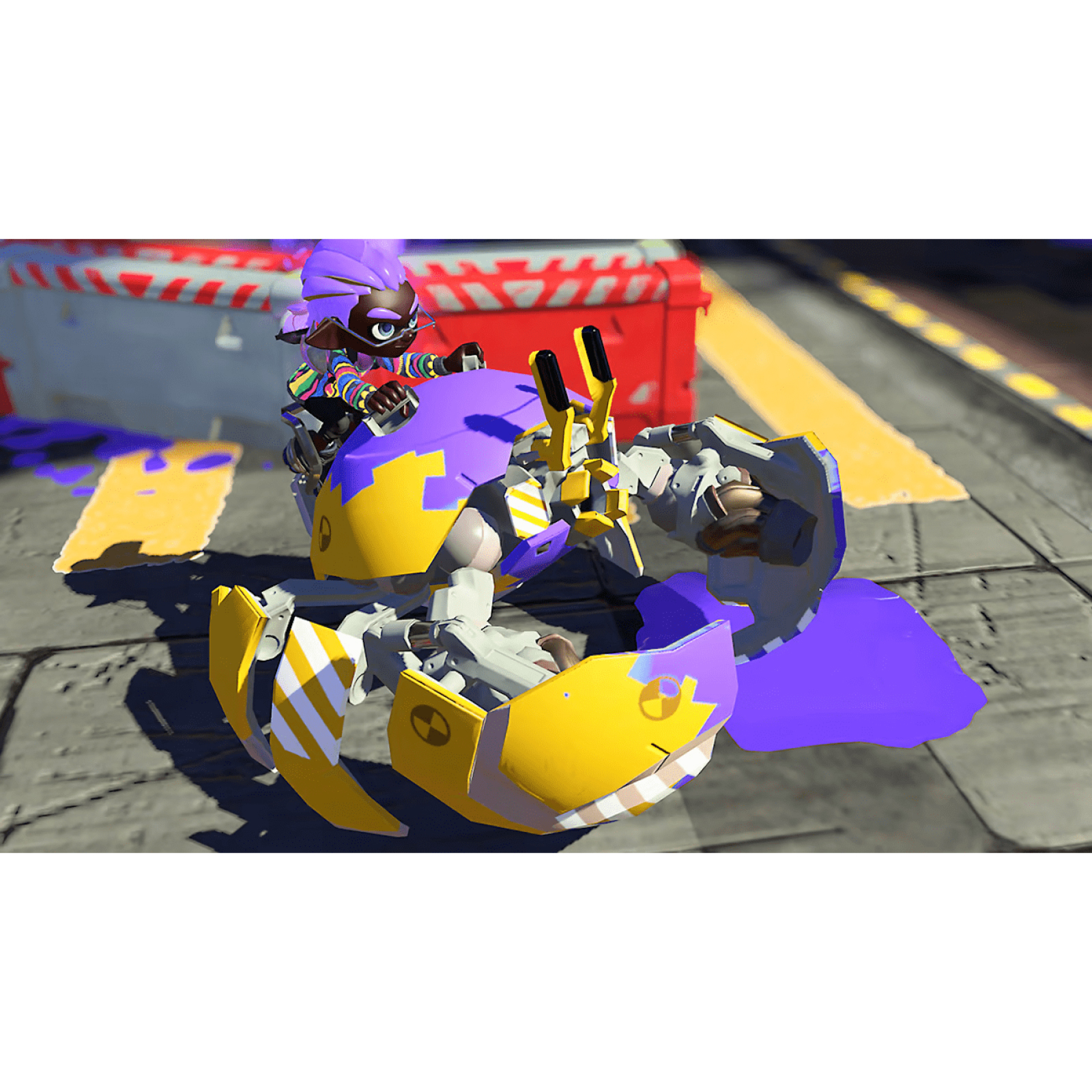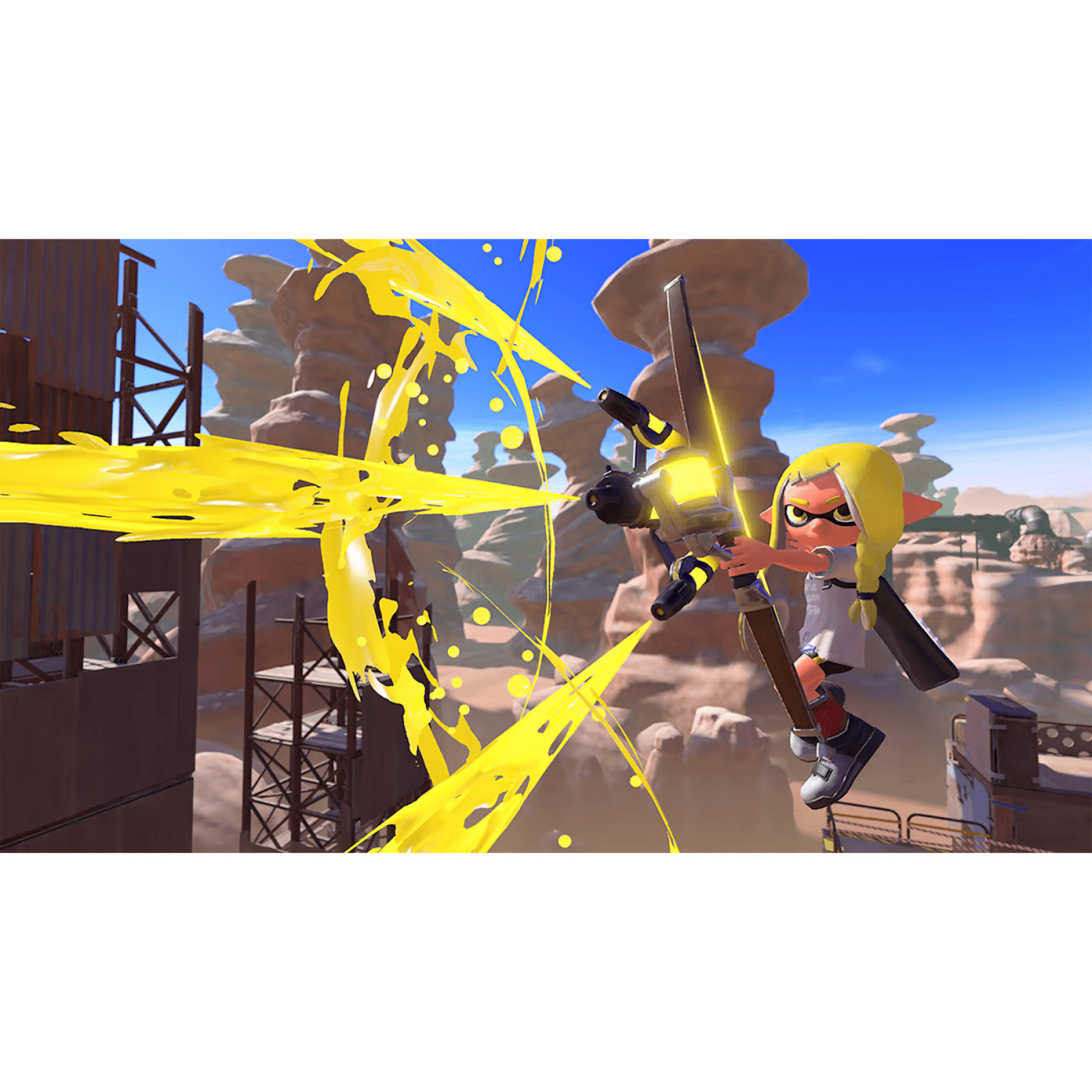 Even in this desolate environment, Turf War* reigns supreme and battles rage in new stages located in the surrounding wilds. Dynamic new moves help these fighters dodge attacks and cover more ground, along with a new bow-shaped weapon to sling ink.
