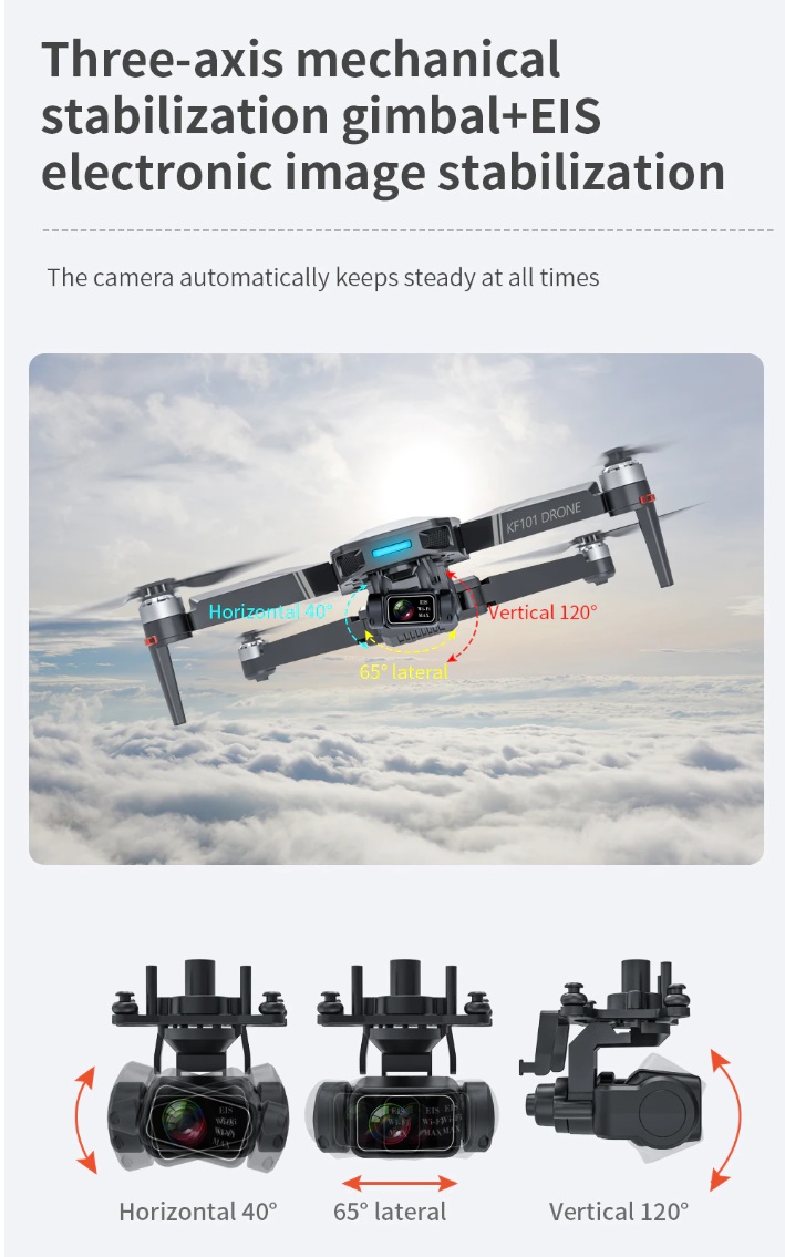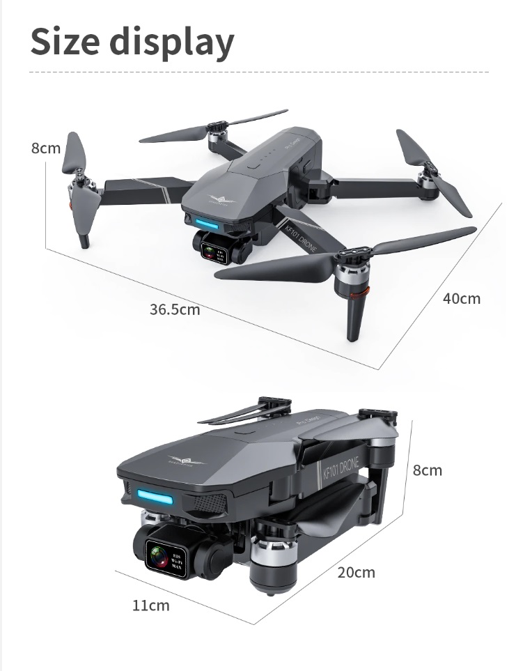 Item No: KF101 MAX Color :Dark Grey Frequency :2.4G (Remote Control) & 5G (Mobile Phone) Drone Battery :11.1V 2500mAh Control Distance : 3KM For KF101 MAX Wifi Image Transmission Distance : 3KM Flight Time : About 25 min Charging Time : About 6 hours USB Charging : 5V/2A Drone Weight : 613g (Needs drone registration in Singapore) Remote Control Battery : 3.7V 1000mAh Transmitter Charging Time : About 60min Transmitter Operating Time : About 10 hours Camera : 3 -Axis Electronic Stabilization Gimbal EIS electronic image stabilization Camera Camera Lens : 120° Photo Resolution (APP) : 3840*2160 P Video Resolution (APP) : 1280*720 P Photo Resolution (SD Card) : 2560*1440 P Video Resolution (SD Card) : 2560*1440 P Frame Rate : 30fps Photo Format : JPG Video Format : MP4 or AVI Adjustable Angle :90° Gesture Shooting : 1-3 M GPS Follow Me : 30 M+ SD Card Supports 32G-128G(Not Included) Mobile Device System Version : iOS 8.0 or later / Android 4.4.4 or later
