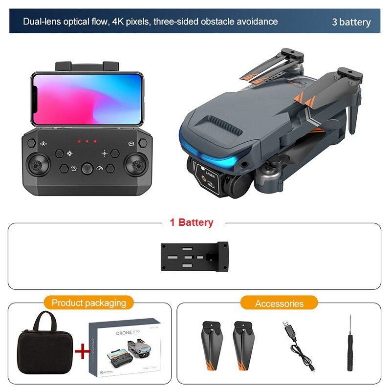XT9 Drone Description: Product Name: XT9 drone with 4K HD Dual Camera Item NO.: XT9 Material: ABS Plastic & Electronic Components Color: Black Gyro: 6-axis Frequency: 2.4G Channel: 4CH Motor: 716 Brushed Coreless Motor Battery: 3.7V 1800MAH Lipo Battery (Included) Transmitter Power: 3 x AAA Battery (Not Included) Transmitter Mode: Mode 2 (Left Hand Throttle) Flying Time: about 15mins Low Flying Speed: 2m/s Medium Flying Speed: 4m/s High Flying Speed: 7m/s Charging Time: 120 minutes RC Distance: 80-100m FPV Distance: 30m FPV: WiFi Camera:4KDual Camera Resolution: 4K Camera Angle: Electric regulation Adjustable 180°- 90° Quadcopter Size: 18*12.5*4.5CM (Unfolded) 13*7*4CM (Folded) Package Weight: 460g Package Size(BOX): 22.5*17.5*7 CM