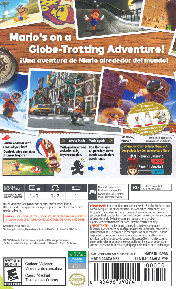 Mario embarks on a new journey through unknown worlds, running and jumping through huge 3D worlds in the first sandbox-style Mario game since Super Mario 64andSuper Mario Sunshine. Set sail between expansive worlds aboard an airship, and perform all-new actions, such as throwing Mario's cap.